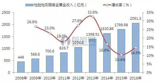 前瞻产业研究院发布的《2017-2022年中国质量检验检测产业发展前景与投资预 测分析报告》显示,2016年我国检验检测认证服务业营业总收入突破2000亿元人民币,成为全球增长最快的检验检测认证市场。从今后发展方向看,检验检 测认证是国家大力发展的新兴服务业,做大做强是发展方向。