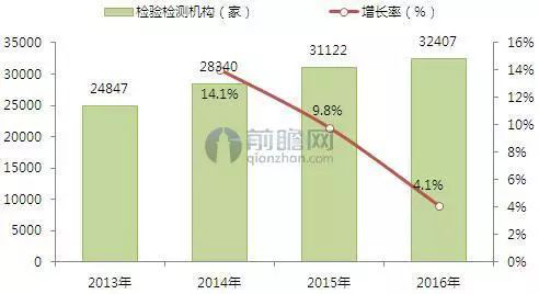 从机构数量看,截至2016年底,全国各类检验检测机构共计32407家,较2014年度增长9.82%,近三年年均增长11.92%,中国总体上已处于国际认证认可发展的第二阵营,正加快迈入认证认可强国行列。