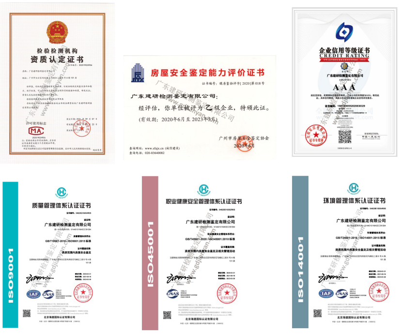 广东建研检测鉴定有限公司是经广州市工商行政管理局批准成立具备建设行政主管部门专业技术备案资质及检验检测机构计量认证CMA资质的房屋安全检测鉴定机构,房屋安全鉴定机构能力评价等级为乙级,现为广东省建设工程质量安全检测和鉴定协会、广州市房屋安全鉴定协会、佛山市顺德区工程勘察设计咨询协会、广州市白云区不动产服务行业协会、广东省市政行业协会、中国物业管理协会房屋安全鉴定委员会会员单位。公司注册资金2080万,主要从事建设工程领域检测和房屋质量鉴定相关的技术服务,开展房屋工程质量检测、工商注册年审房屋安全鉴定、施工周边房屋安全鉴定、房屋抗震性能鉴定、建筑可靠性(安全性和使用性)鉴定、危险房屋鉴定、应急抢险及灾后房屋结构安全检测鉴定、建筑幕墙工程检测、钢结构工程检测、民用建筑工程室内环境检测等业务。